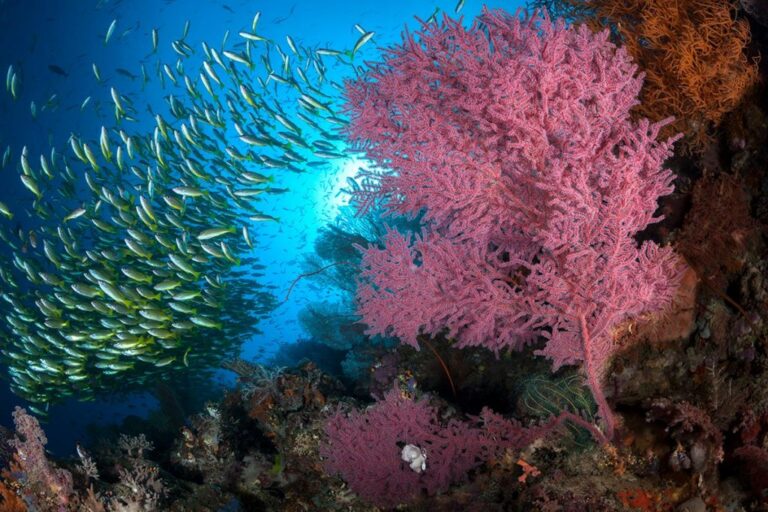 Następnie, w sercu Halmahery, znajdziemy kanał w Cieśninie Patintie, gdzie szczyty i formacje koralowe różnią się ze względu na prądy przepływające przez kanał – w miejscu gdzie spotykają się dwa morza! Saleh Kecil to mała wyspa w cieśninie, która zachwyca imponującymi formacjami koralowymi, łagodnymi zboczami i bujnym życiem morskim, od makroskopijnych rozmiarów po duże gatunki pelagiczne. Różnorodność biologiczna jest tu zdumiewająca! począwszy od rekinów rafowych, barakud i kolorowych ławic ryb…